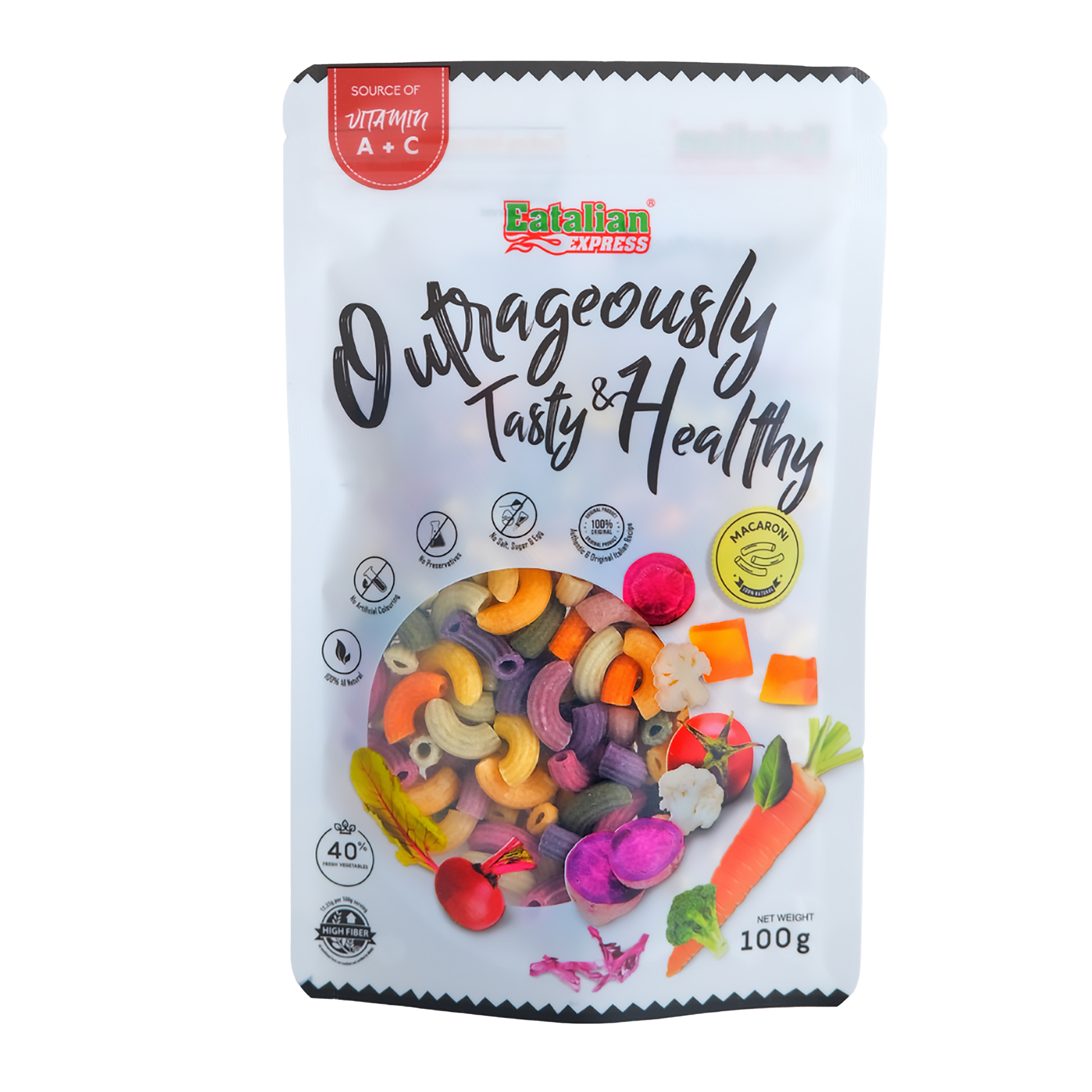 - Made from a combination of 10 different types of fresh vegetables, durum wheat semolina flour and water. The vegetables used are - spinach, carrot, pumpkin, broccoli, beetroot, sweet potato, tomato, red spinach, purple carrot and cauliflower.