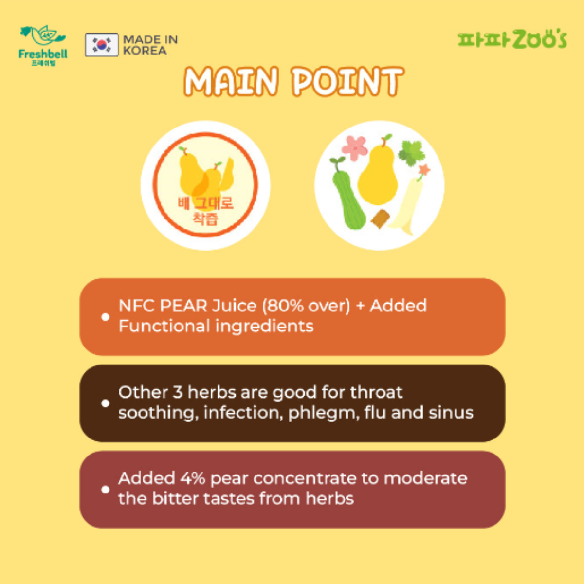- GAP Certified Only use GAP certified Pears as ingredients which was produced and processed following the guidelines from Korea ministry of Agriculture, food and rural affairs.