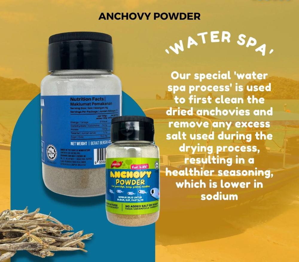 - Our special 'water spa process' is used to first clean the dried anchovies and remove any excess salt used during the drying process, resulting in a healthier seasoning, which is lower in sodium